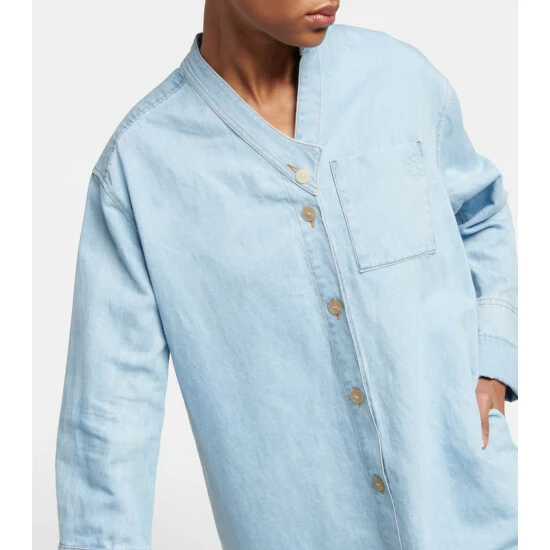 This denim shirt dress from Loewe can be worn alone or layered over pants. Crafted from a cotton and linen blend, the style features an asymmetrical collar and hem, and is finished with French cuffs.
