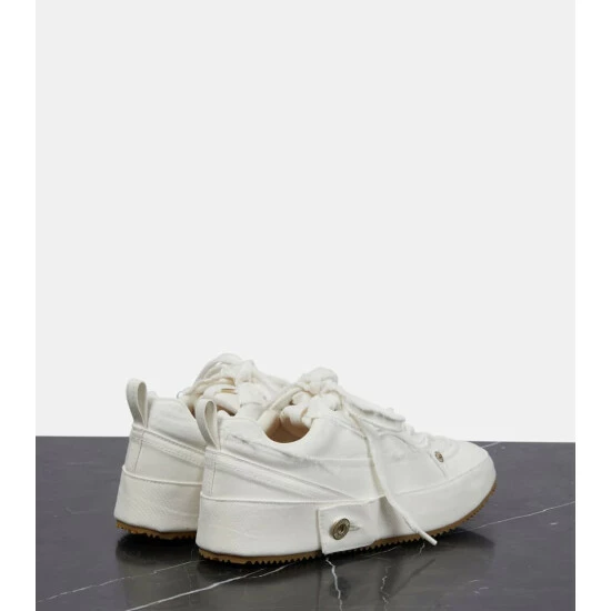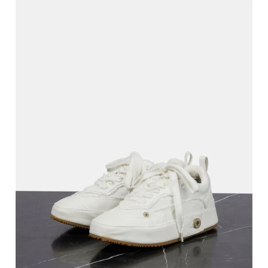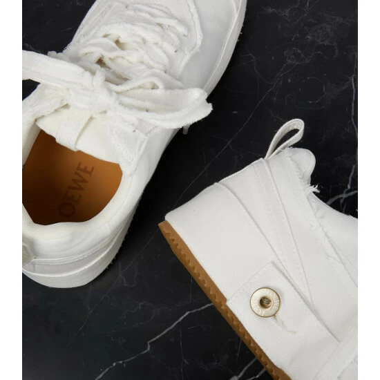 We’re intrigued by the deconstructed design of these Loewe sneakers. From the raw-edged denim paneling to the metal rivets and tonal topstitching, it appears as if they’re crafted from a pair of repurposed white jeans.