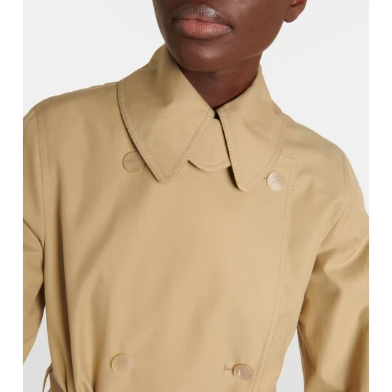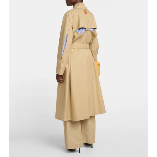 This trench coat from Loewe is made in Italy from pure cotton in a double-breasted design. It features a pointed collar and a fabric self-tie belt that cinches the waist for a flattering silhouette.