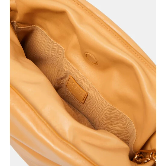 The Flamenco Puffer clutch -a voluminous update to a Loewe signature- highlights the brand’s legacy of craftsmanship. The nappa leather design is padded with goose feathers and stays true to the original style with knotted drawstrings.