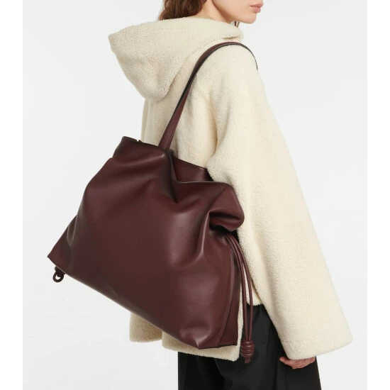 The dark purple Flamenco XL shoulder bag from Loewe is handmade from grained leather with a herringbone canvas lining. It has soft, accordion-like pleats and coiled drawstring knots – a signature of the Spanish house.