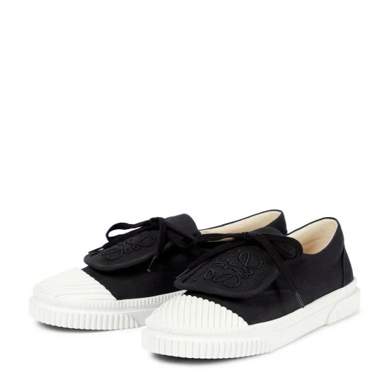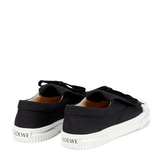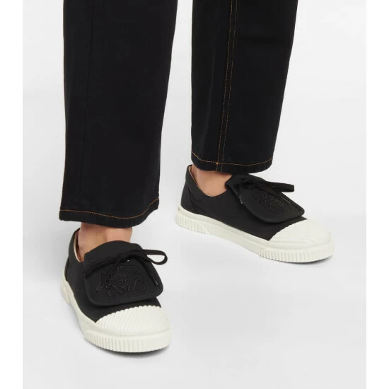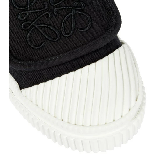 Loewe’s black Flap sneakers are aptly named due to the exaggerated tongues, which are reminiscent of golfing styles. Made from Anagram-embroidered canvas, they have grooved toe panels and coordinating white rubber soles.