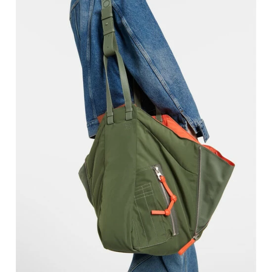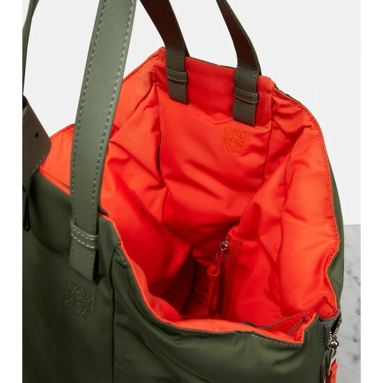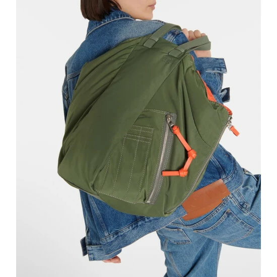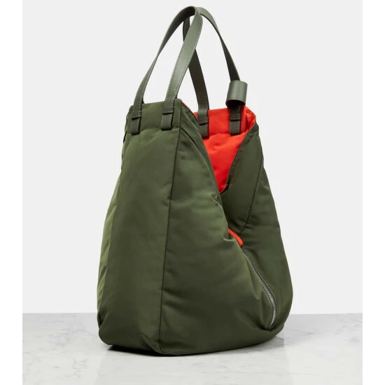 A reversible design, the Hammock tote bag showcases Loewe’s coveted expert craftsmanship. Khaki-green on one side, orange on the other, it’s made from durable nylon with a logo jacquard shoulder strap, leather top handles, and zipped side panels that can be released to create more space.
