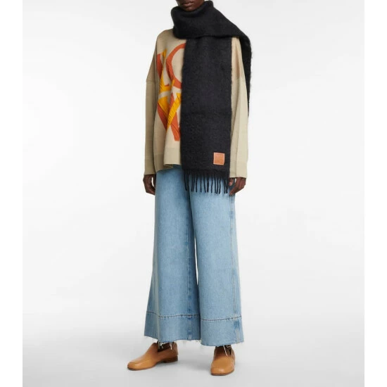 Equip yourself for decreasing temperatures with this oversized black scarf from LOEWE. Made from a tactile mohair and wool-blend, this accessory is finished with exaggerated tassel detailing. Layer yours over neutral and color-block ensembles in equal measure – ensuring the label’s leather Anagram patch stays on full display.
