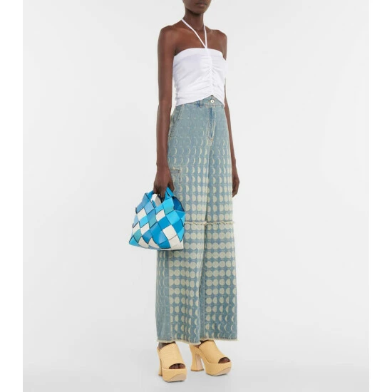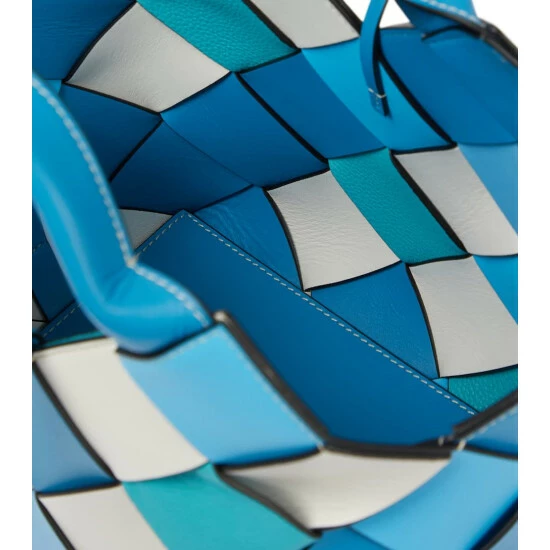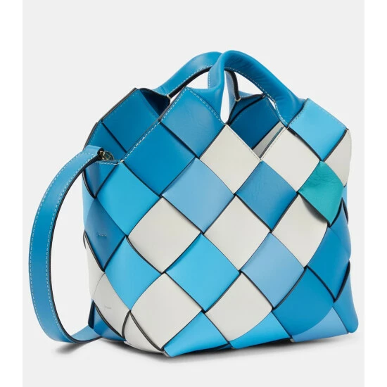 The Woven Basket tote from Loewe’s Paula’s Ibiza collection displays a multicolored weaving pattern. Made from smooth leather straps, it has a detachable and adjustable leather strap.