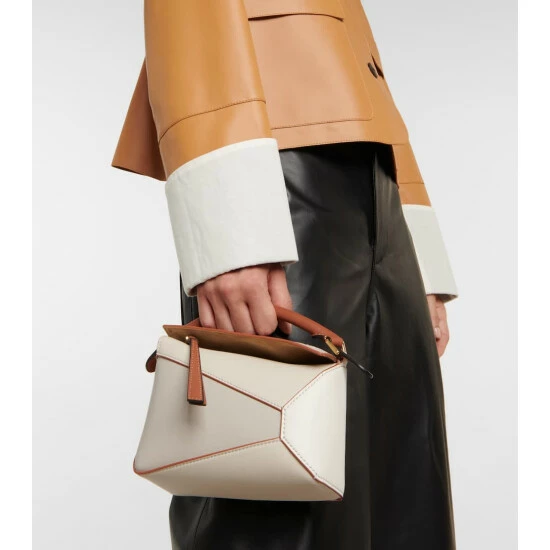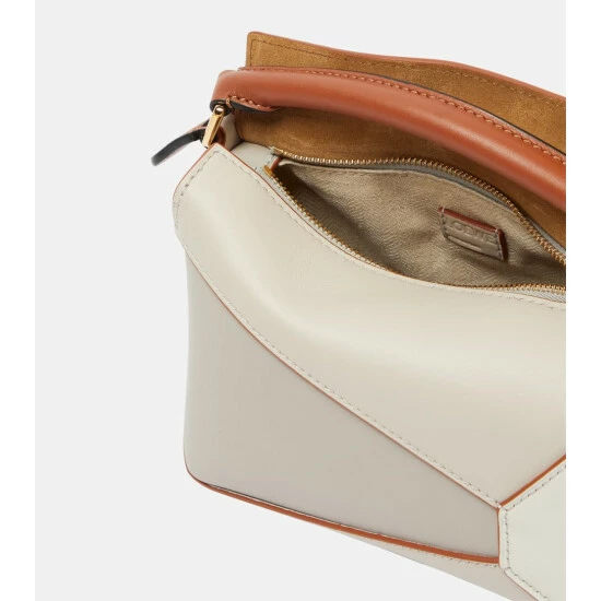 When expert craftsmanship and innovative design meet, you get the gray and camel Puzzle Mini shoulder bag from Loewe. Jonathan Anderson wanted to create a bag that mirrors the brand’s multi-faceted identity, so leather artisans cut its smooth calfskin panels into unique geometric shapes and placed them in a now-iconic asymmetric setting. Swing yours by the long strap or carry it in-hand – the latter manipulating the leather into a softer shape.