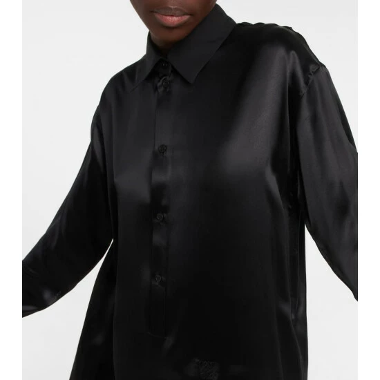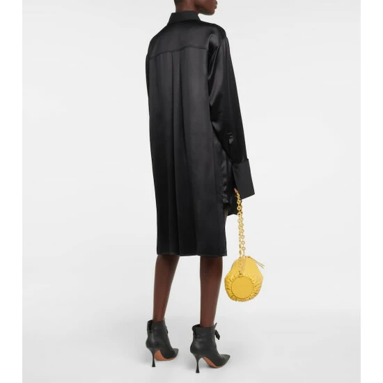 Desk-to-dinner transitioning is as easy as styling this shirt dress from Loewe. It’s made from lustrous silk satin for a relaxed, oversized fit with exaggerated cuffs, dropped shoulders, a stepped hem, and mid-length button placket.