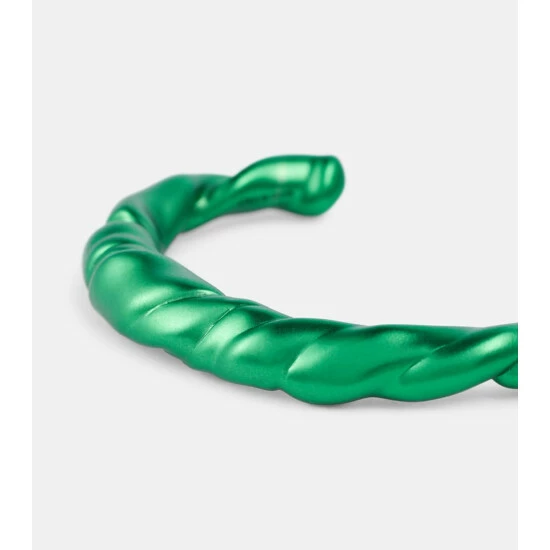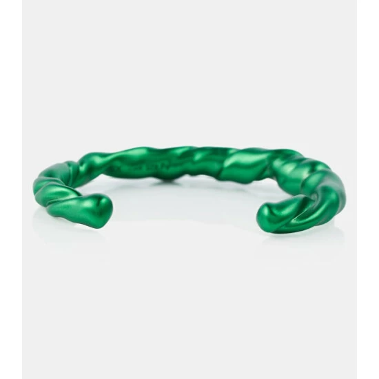 This sterling silver arm cuff from Loewe is manipulated to look like twisted leather. It’s varnished in green and has subtle logo engraving at one tip.