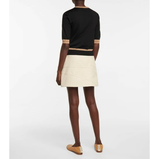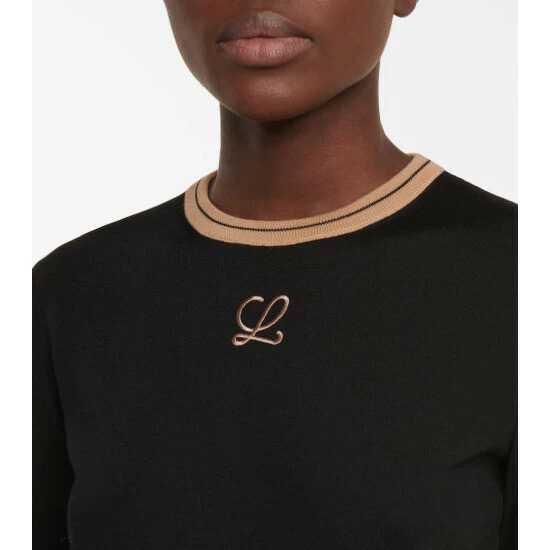 This black LOEWE sweater is a sophisticated summer knit. Made in Italy from a lightweight wool, it has a straight silhouette with a slightly cropped hem that hits the hips. It’s trimmed in beige stripes and embroidered with the label’s L monogram in metallic threading.