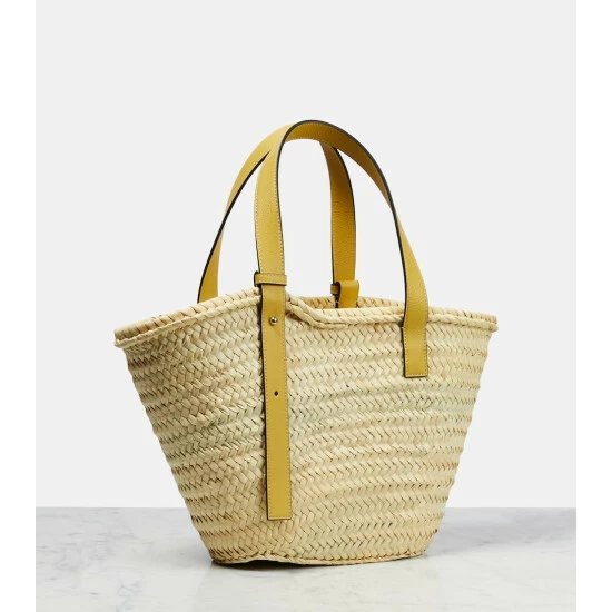 A tribute to the film Howl’s Moving Castle, the latest collaboration between Loewe and Studio Ghibli celebrates a shared love of craft and imagination A coveted silhouette among fashion insiders, this Medium basket tote is hand-woven from palm leaves with leather straps and an Anagram patch in a yellow color scheme that coordinates with the collection.
