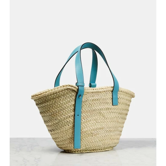 A tribute to the film Howl’s Moving Castle, the latest collaboration between Loewe and Studio Ghibli celebrates a shared love of craft and imagination A coveted silhouette among fashion insiders, this Medium basket tote is hand-woven from palm leaves with leather straps and an Anagram patch in a blue color scheme that coordinates with the collection.