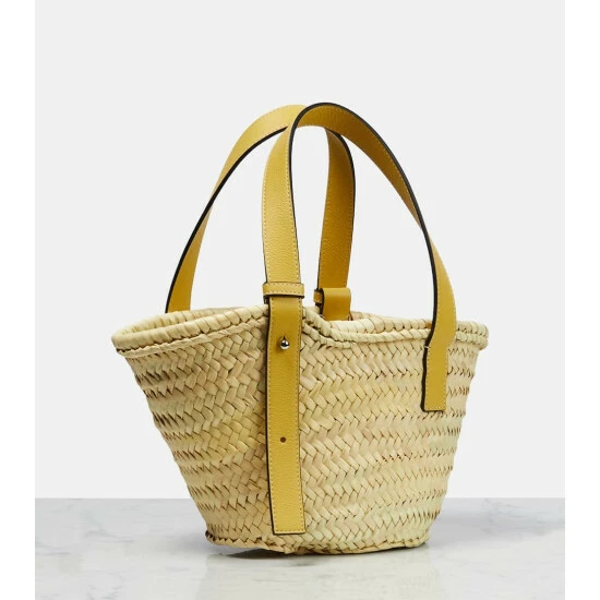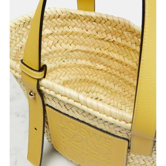 A tribute to the film Howl’s Moving Castle, the latest collaboration between Loewe and Studio Ghibli celebrates a shared love of craft and imagination A coveted silhouette among fashion insiders, this Small basket tote is hand-woven from palm leaves with leather straps and an Anagram patch in a yellow color scheme that coordinates with the collection.